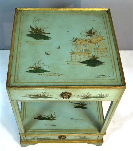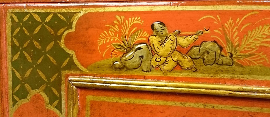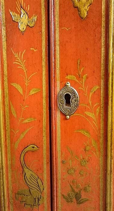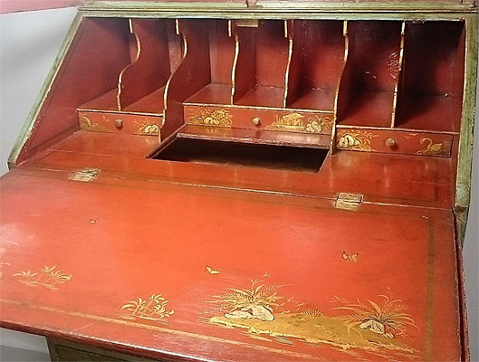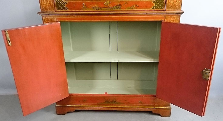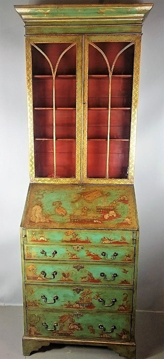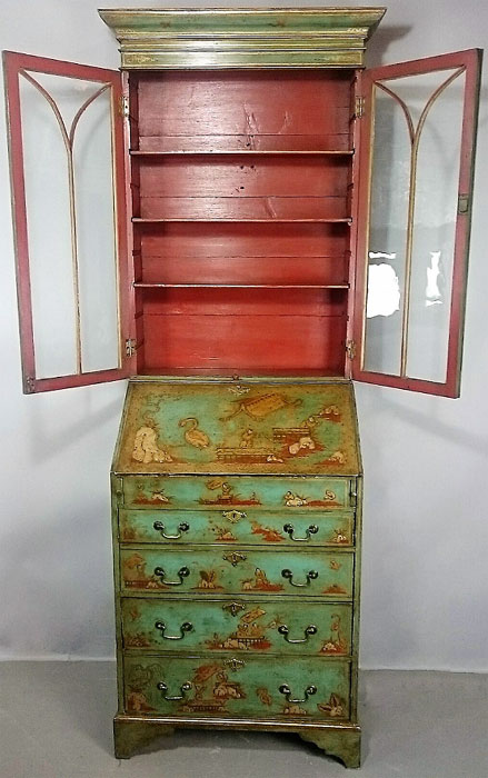 Pale green Chinoiserie Bureau bookcase of small proportions with red interior. £2800.00
