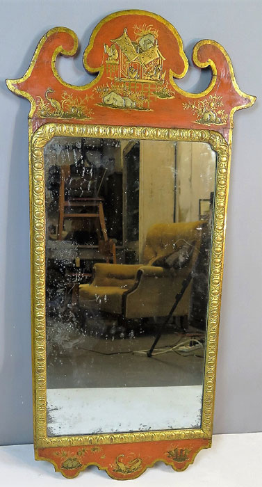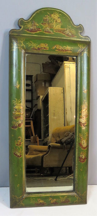 Red chinoiserie mirror. £425.00/Green chinoiserie cushion mirror. £385.00