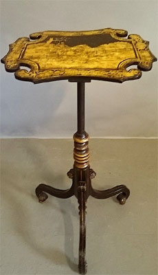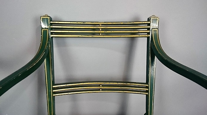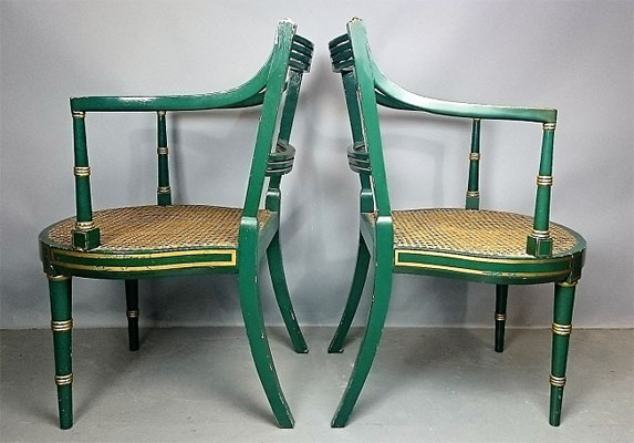 Pair of Regency open arm chairs with green and gilt decoration with caned seats. £480.00